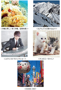 提供コンテンツは『沖縄の美しい海(沖縄、座間味島)』『北アルプスの雄大な山々』『ユウリ3Dマジックショー』『ネコのミーちゃん』『OSAKA 360』の5つ。