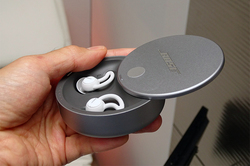 イベント会場に展示された実機で効果を試す機会も得た。小さい円筒形の充電ケースのフタを開け、マグネットで吸着されたイヤホンをそれぞれ取りだして耳に挿入する。イヤホンを着けていることを思わず忘れてしまうほどフィット感は良好だ。これならパートナーのいびきよりも先に、耳に着けているイヤホンが不快で目覚めてしまう、といったこともなさそうだ。