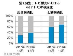 特にこうした動きをけん引しているのが4Kテレビであり、2018年1 − 5月の4Kテレビ販売は、数量前年比26%増、金額前年比16%増となった。結果、同期間の薄型テレビ販売における4Kテレビの構成比は、数量ベースで38%(前年同期29%)、金額ベースで68%(前年同期59%)に達した。