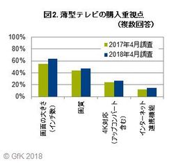 GfKジャパンは、家電量販店、総合量販店、インターネット通販における薄型テレビの販売動向と、購入者調査に基づく購入重視点や活用用途を発表した。