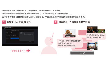 レコーダー6機種の共通の機能として、ユーザーがよく選ぶジャンルや番組名、繰り返し見る番組などをAIが分析・学習して自動的に録画する「AI録画」に対応する。