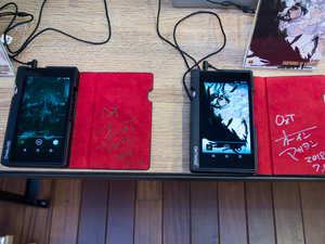 現在ONKYO BASE内では、今回発売となる『オーバーロードIII』コラボ製品 “DAP OF NAZARICK” 「DP-X1A」、 “EARPHONES OF NAZARICK” 「SE-CH9T」が展示されており、DP-X1Aには、オーイシ氏直筆サイン入りケースが装着されている。またアニメ放映に先駆けて、「Silent Solitude」のハイレゾ版を収録した試聴機も用意されている。