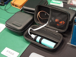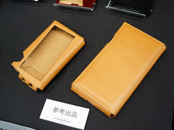 musashino LABELは、Astell&Kern「A&norma SR15」用ケースなどを展示。そのほかにも、モバイルバッテリーも一緒に収納できるようにしたもの、チャック部に防水加工することで湿気への耐性を高めたものなど、様々なケースの試作品も参考展示していた。