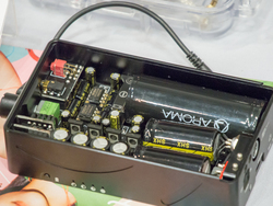 また昨日のニュースリリースでも発表された(関連ニュース)、AROMAブランドのポータブルヘッドホンアンプ「A100」と、イヤホン「Musical Box Star」の試作機も出展された。「A100」はオーソドックスな3.5mmステレオミニ入出力に加え、2.5mmのバランス入出力、4.4mmのバランス出力も搭載、ポータブルオーディオ製品としては高電圧の±15Vで駆動するという製品。価格は未定だが、8月初旬には発売できるという。