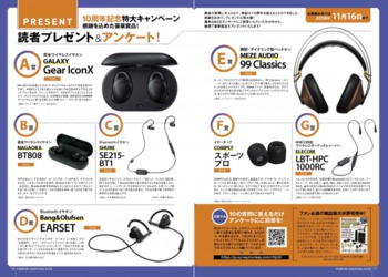 さらに今号では、雑誌スタート10周年の感謝を込めて! 特集で取り上げたGalaxy「Gear IconX」、MEZE AUDIO「99 Classics」など、合計金額約15万円の豪華プレゼントをご用意しています! 特設サイトにあるアンケートページからご回答の方はどなたでも応募が可能です。こちらもぜひ奮ってご応募ください!