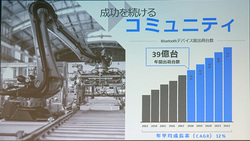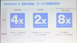 また、Bluetooth 5についても、従来と比べて通信可能距離は4倍、通信速度も2倍、アドバタイジングパケット容量も8倍と技術としてのスペックが大幅に上がっていることをあらためてアピール。「Bluetooth 4.xは5人乗りの車のようものだったが、Bluetooth 5なら40人乗りバスだ」とパケット容量増加を例えるなどし、Bluetooth 5も新興市場の成長を後押しするものであるとした。