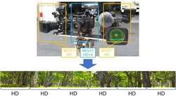 12Kワイドスパン映像は、解像度11,520(12K)×1,080の高解像な横長映像で、撮影には8Kカメラと2台の4Kカメラを使用。合計3台のカメラを特注の台座に固定して撮影し、8K(7,680×4,320)映像と4K(3,840x2,160)映像を組み合わせて切り出すことで、一度の撮影で横一列に並んだ合計6面のHD映像=12K映像を作成したとのこと。