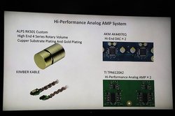 アナログアンプにはTIの「TPA6120A2」を2基搭載。ロータリーボリュームには、世界最高峰のパフォーマンスを誇るというALPSのRK501を、DMP-Z1のために独自にカスタマイズ。銅でコーティングした上にさらに金メッキを施したという。DACはチャンネルセパレーションに有利なAKMの「AK4497EQ」を左右独立で2基採用、内部配線にはKIMBER KABLEを採用したという。