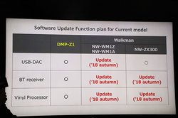 最後に、既発売のウォークマンのファームウェアアップデートも紹介された。2018年秋をめどに、NW-WM1Z/WM1AにUSB-DAC機能が追加される。またNW-WM1Z/WM1A/ZX300の3機種を対象に、Bluetoothレシーバー機能と、アナログレコードの音をシミュレートする「Vinyl Processor」機能が追加される予定だ。