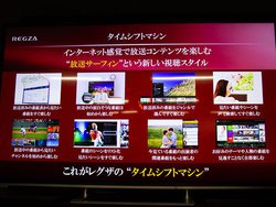 指定したチャンネルと時間帯の番組をすべて自動録画することにより、過去の番組をさかのぼって視聴することが可能になる「タイムシフトマシン録画」機能も搭載。この機能を、「レグザの考える究極のスマート」と本村氏は説明し、スマートフォンでのネットサーフィンならぬ「放送サーフィン」という、インターネット感覚で楽しめる新しい視聴スタイルを実現できるとしている。