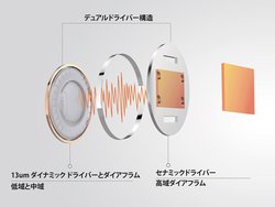 ドライバーは、中低域用と高域用に並列する2枚の独立した振動板を配置して構成。中低域用にセラミックス振動板、高域用にダイナミック型振動板を配置した13mm口径のハイブリッドドライバーとしている。これにより、広い音場とバランスの良い音を実現したとしている。