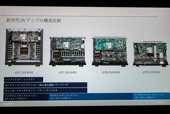 デノンのAVアンプで各ch独立基板のパワーアンプを搭載する「モノリス・コンストラクション」を採用するのは、AVC-X8500HとこのAVC-X6500Hの2機種。パワーアンプ基板については、使用するパーツのグレードはもちろん異なるが、アンプ回路の構成は両モデルでほぼ同じだという。なお、AVR-X4500Hは9chアンプを2枚の基板に分けて搭載している。