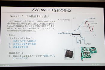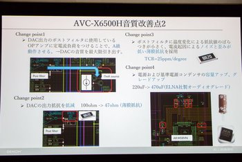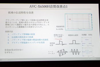 AVC-X6500Hは、従来のAVR-X6400Hから具体的にはどのような点をブラッシュアップしたのだろうか。高橋氏は「低域の伝送特性の改善」「D/Aコンバーター部の改善」という大きく2つの改善ポイントを挙げ、その詳細を説明してくれた。