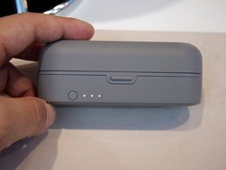 充電ケースの質量は約68g。3段階のLEDを装備しており、LED左側のボタンを一度押すと青色でケースの電池残量を、もう一度押すと白色でイヤホン本体の電池残量を表示する。ケースの充電は約5時間、端子にはmicroUSBを採用した。