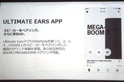 アプリはこれまで製品ごとに別々のものが用意されていたが、本製品より共通して使用できる「ULTIMATE EARS」を用意。スピーカー連携機能「PartyUp」を使って、最大150台までのスピーカーをペアリングして同時再生が可能。また過去世代BOOM/MEGABOOMにも対応する。他にも複数のスマートフォンと接続して音楽再生ができる「パーティーモード」や、電源のON/OFF、イコライザー設定なども可能。