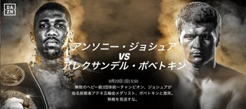 DAZN(ダゾーン)は、9月22日に英ロンドンで開催されるボクシングマッチ、WBAスーパー・IBF・WBO統一王者アンソニー・ジョシュア(英)VS アレクサンドル・ポベトキン(露)のタイトルマッチを独占ライブ中継する。