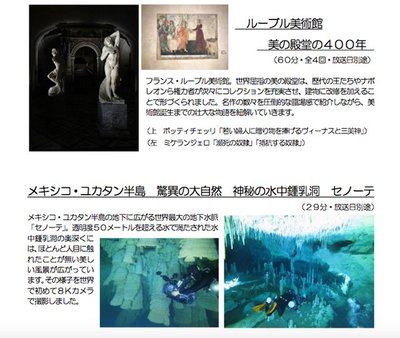 音楽番組は、ウィーン・フィル、ベルリン・フィル、ロイヤル・コンセルトヘボウの三つのオーケストラによる重厚な演奏を22.2chの立体音響で楽しめる「世界三大オーケストラの響き」や、宝塚歌劇団の5組全ての公演を完全収録して放送。美術番組では、フランスとの国際共同制作番組「ルーブル美術館美の殿堂の400年」を4回にわたって放送。また、若冲や北斎の作品を取り上げた番組、エジプトのツタンカーメンの黄金財宝を紹介するシリーズなども予定している。
