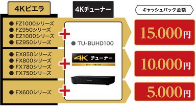 2つ目は「4Kビエラ+4Kチューナー」の組み合わせで、4K有機ELビエラ・4K液晶ビエラと、4Kチューナー「BUHD100」の組み合わせに応じてキャッシュバックされる。