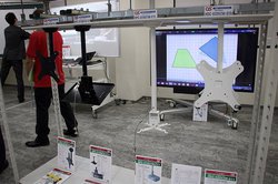文教向けの製品では、可動式のディスプレイスタンドやマグネットスクリーンを展示。インタラクティブデスク「DSH-80E-T-S1」は電動で昇降・チルト調整が可能で、マグネットスクリーンと組み合わせて、デスクの様な状態で書き込みをするといった事もできるとアピール。こうした製品開発には、実際に設備導入した学校などからの要望を広く取り入れられ、既存製品においても都度改良が施されているという。