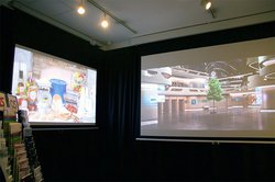 パブリックビューイングなどの利用を想定したVRシステムは、1m四方のスクリーンをマルチユニット式フレームを用いて「コの字型」「ロの字型」など環境に合わせて配置し、ヘッドマウントディスプレイ無しに360度映像を視聴できるというもの。スクリーン生地は拡散性の高いものを使用。また360度カメラで撮影した映像などもPCソフトで補正をかけて表示可能とのこと。会場ではプロジェクター3台を使用し、正面、床、左右の4面にスクリーンを配置して映像を表示していた。