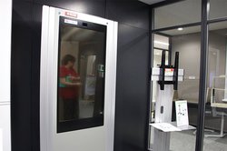 同スペースにはペーパースクリーン「WM201」や業務用4K対応スクリーン「WF801」なども展示。2種類の異なる織り方を同時に織る特殊二重織や、環境に配慮しだ“脱塩ビ”生地の使用、防炎対応など同社製品の特徴を紹介。また、一つ一つ人の目でチェックを重ね、使用可能な部分のみスクリーンとして製品化するなど、同社のスクリーン生地開発へのこだわりもアピールしていた。