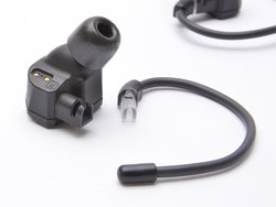 イヤホン本体はネジや角張りが特徴のメカニカルなデザインで、同梱のイヤーフックを取り付けることで装着時の安定感を高める事が可能。