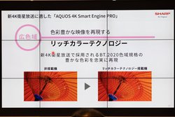 さらに色再現領域では、新4K衛星放送で採用されるITU-R BT.2020に迫る豊かな色彩を再現するという「リッチカラーテクノロジー」を採用。HDRはHDR10とHLGに対応する。また地上デジタル放送などの2K映像については、精細感を復元しノイズを抑えたクリアな映像を実現するという。