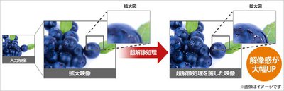 低解像度の映像でも美しい表示を目指す「超解像技術」も搭載。好みに合わせて10段階で設定できる。また映像を鮮やかに表示させれる「エンハンストカラー」機能を搭載しており、こちらも10段階で調整がおこなえる。そのほか表示色の調整は通常の赤・緑・青の3原色にくわえ、補色の水色、赤紫色、黄色の調整が可能。この調整により、赤い花の色や青い空や海の色、緑鮮やかな木々の色などを強調し、鮮やかに表現できるとする。