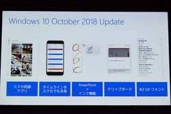 また、Windows 10の最新アップデート「October 2018 Update」も紹介された。このアップデートでは、使用したことのあるファイルを時系列順で一覧できる「タイムライン」、スマートフォンとの通知やファイルの共有機能、今までのコピー履歴からペーストができる「Windosキー+V」のショートカット、顔文字が呼び出せる「Windowsキー+.」ショートカットが利用可能となる。