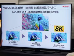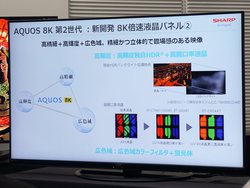 パネルには、8K(7,680×4,320)で120Hz駆動可能な液晶パネルを採用。、視野角は176度。このパネルは新開発のもので、開口率が高い。70型・60型モデルには「UV2A液晶」、 80型モデルにはUV2A液晶をさらに改良した「UV2AII液晶」を採用する。加えてバックライトに使用する直下型LEDを、「メガコントラスト」技術によって部分駆動することで、さらなる画質向上を図った。これにより80型モデルでは、従来の4倍の輝度を達成し、明るく切れの良い画質が表現できると説明した。また色域も従来から向上。新しいカラーフィルターや蛍光体を用いることで、人の目が鮮やかさを感じやすいという赤色の再現力が向上、これにより従来から色域が17%(80型)拡大したという。