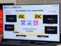 本製品は、12月1日から開始される新4K8K衛星放送に向けたもの。テレビの発表と同時に「AQUOS 8K HDD」「AQUOS オーディオ」「AQUOS 8Kチューナー」といった8Kに対応する周辺機器も発表された。今回の発表により、先日発表された4Kシリーズ(4Kテレビ/4Kレコーダー/4Kチューナー)とあわせて「新4K8K放送に全面対応した」と同社はアピールしている。