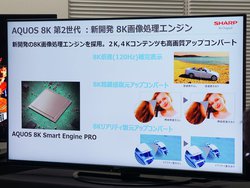 映像エンジンには、新開発の8K画像処理エンジン「AQUOS 8K Smart Engine Pro」を採用。これにより8K倍速(120Hz)の補間表示が行えるほか、2Kや4K映像の精細感を推測・復元するという「8K精細感復元アップコンバート」を搭載した。またこれとあわせて「8Kリアリティ復元アップコンバート」も搭載。アップコンバート後に元の素材の形状が再現されない場合があるというが、この機能により形状を推測し、理想的に復元することができるという。ノイズを低減する「8K 3Dノイズリダクション」も備える。