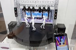 CEATEC会場では、最新の技術を活用したエンターテインメントを紹介するブースもある。バンダイナムコグループのブースには、フィギュアとステージ、サイリウム型コントローラーでライブが楽しめる「デスクトップライブベース」などが展示された。