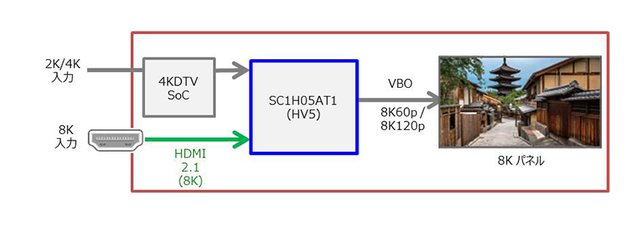 「SC1H05AT1」は8K対応テレビ向けに最適化した映像処理チップで、日本国内で本放送が開始される4K/8K放送システムへの対応に加え、外部入力による8K映像の表示処理機能により8Kコンテンツの再生にも対応する。