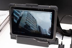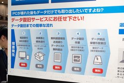 ほかにもエレコムブースでは、複数のNASのログをまとめて確認できるシステム、防犯カメラ、タフなWindowsタブレット「ZEROSHOCK」など業務用の製品を多数展示していた。その中でエレコム子会社、ロジテックによるデータ復旧サービスの展示があり、日本で10社ほどしかないハードディスクの物理損傷にも対応できるサービスだとアピール。担当者によると、PCだけでなく、SSDやオーディオ用のNAS・サーバーの復旧も受け付けているとのこと。復旧できるかの調査まで無料なことも大きな特徴で、個人からの申し込みも可能とのことだ。