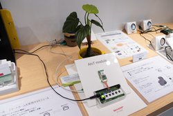 また、シャープ製品に搭載するAIoTモジュールも展示、現状では搭載製品は先述のスマートロックのみだが、「年末頃には搭載製品が出てくるのでは」という。シャープのAIoTは「音声が特徴」とのことで、販売されるモジュールは「音声出力」「音声出力・入力」の2種類。展示では 鉢植えにこのモジュールが取り付けられ、鉢植えから音声による案内を実施。その横では日本気象協会がぜんそく予防アプリ「ぜんそくリスク予報」のデモを行っており、気象情報とシャープのAIoTを利用することで、週間気温を元にエアコンなどを動作させたり、問診を家電からの問いかけで行うといった取り組みを紹介していた。
