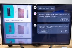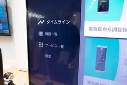 さらにスマホアプリも展示、テレビと同じように確認できる。後述するAIoTモジュールを搭載した製品であればこのタイムライン上に表示も可能で、会場ではアッサアブロイジャパン社のスマートロックが展示、解錠するとロボホンが「おかえり」と話し、解錠した通知がテレビのタイムライン上に映し出されていた。