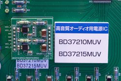 ロームのブースでは、8月に国内で披露された(関連ニュース)、「MUS-IC」シリーズのオーディオ用電源IC「BD37210MUV/BD37215MUV」がデモ展示。同社のサウンドプロセッサーIC「BD34704KS2」と組み合わせた基板が用意され、通常の電源と音質が比較できるようになっていた。