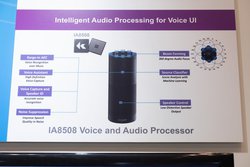 また、イヤホン・スマートフォンなどに搭載されるMEMSマイクも展示。同社のMEMSマイクは、スマートフォンに搭載しているMEMSマイクで9割以上のシェアを誇るという。また、DSPを搭載したMEMSマイクはAmazon Echoなどに搭載しており、DSPによりコマンドの発話によって動作させるということが可能。消費電力が少ないので、ワイヤレスイヤホンにも搭載されているとアピールしていた。