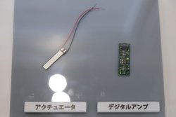 オーディオ・振動アクチュエーターは、アクチュエーター(ピエゾ素子)と専用のデジタルアンプをあわせることで音声を再生するもの。従来から低音の再生能力を向上させたという。低音を向上させたことで、骨伝導ヘッドセットや、VR・AR用の振動を感じるイヤホンなどでの活用が期待されるとのことだった。