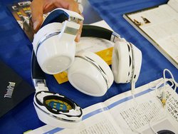 FPSは、平面駆動ドライバーを搭載したBluetoothヘッドホン「Powered HEADSPEAKER」を展示した。φ60mmのフラットパネルドライバーをハウジングに備えており、平面駆動ドライバーに最適化したDSPを内蔵している。
