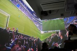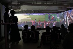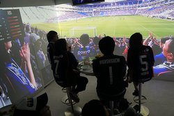実際に体験してみると、側面スクリーンにも多数のサポーターが映っている(しかも動いている)ことで、たしかに現地にいるかのような感覚を味わえる。一般的なパブリックビューイングとは一味違った体験だ。「今回は天井高が足らずに3面での上映となったが、天井面にもスクリーンを追加することが可能。そうすればさらに臨場感を高められる」(スタッフ)という。