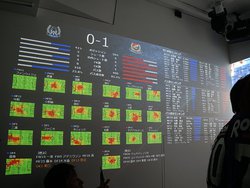 一方、ビッグエコー会場で試合後半に行われた「正面に大きな中継映像、側面に詳細データと実況解説映像」という構成のほうが現時点では“アリ”ではないかと感じた。壁面いっぱいに選手ごとのヒートマップや走行距離、パス数ランキングなどの詳細なデータを横目で見ながらの試合観戦はなかなか興味深かった。
