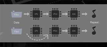 楽曲データの読み込みにはCPUを使用せず、専用のFPGAによりダイレクトに読み出す技術「ATMP Technology」を採用。データストリームの遅延を大幅に抑制し安定した信号伝送を行うと共に、CPUを介さないことでOSがオーディオに与える影響を軽減。音の再現性、立ち上がりの素早さ、きめ細かさ、明瞭さなどの音質向上を実現しているという。
