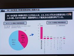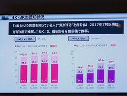 「4K」という言葉の認知については、2016年9月時点で83%が認知(「知っている」「知っているような気がする」の合計)であり、2018年9月でも86.3%と高止まり。「8K」という言葉についても最新の調査で6割弱(59%)が認知しており、「4K8Kが世の中に浸透してきている」としている。