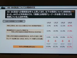 こうした調査結果についてA-PABは「理解度は上昇しているがまだ十分とは言えない状況」だとコメント。「BS放送の受信可能世帯は4,000万超あり、全世帯の75%がすでにBS 4K放送も受信できる状況にある。4Kテレビの世帯所有率をこれで割ると、日本全体の約12%がBS 4Kを受信可能ということになる」(A-PAB 福田理事長)とし、「対応チューナーやチューナー内蔵テレビがこれから各社から発売される。一方で我々も周知のためにさらに何かやっていかなければいけないという若干のあせりもあるのも事実」と、さらなる周知広報の必要があるとの認識も示した。