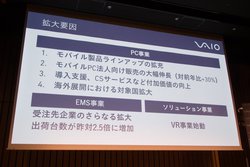 まずPC事業では、モバイル製品のラインナップ拡充、法人向け販売の大幅な伸長を挙げた。ラインナップに関しては、今年に入り同社独自の機能を搭載したモデルや、往年のVAIO製品を想起させる仕上げの限定モデルなどを続けて発表した事が大きいとし、来年初頭にも新たな製品を展開するなどラインナップ拡充を継続していくとした。