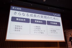 そのための成長戦略として、吉田氏は「独自性のある製品拡充」「営業力強化」「ソリューションやサービスによる付加価値向上」の3本柱を提示、投資や人材登用の拡充を図るとした。本日発表した2in1 PC「VAIO A12」(関連ニュース)も、上記戦略のうち「製品拡充」に則った製品としている。