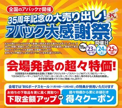 また、メイン会場のアバック新宿本店では3日間限定のスペシャル商談会を同時開催。いずれも参加無料とのこと。さらに、アバック各店舗にて創業35周年記念の来店限定セール企画『アバック大感謝祭』も同日開催(詳細はこちら)。プロジェクター、スクリーン、AVアンプ、CD/SACDプレーヤー、スピーカーなど人気商品から厳選したモデルを特価販売するとのこと。価格は当日会場にて発表される予定。