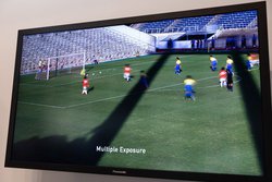 メリットは大きく3つあり、1つはダイナミックレンジの広い映像を撮影できるということ。HDR映像が普及していく今後では、大きなメリットになると担当者は語った。2つめは、グローバルシャッターにより、映像でローリング歪みが発生しないこと。従来のCMOSセンサーでは上から順に読み込んでいくため、例えば映像をパン(横にスライド)したときなど、物体の形状が歪んでしまう。一方、有機センサーは、全体を1度に読み込むため、この歪みが起きない。そして3つめのメリットは、多重露光が可能なこと。説明映像によれば、サッカーの玉の軌跡などを表示することができるとのことだった。